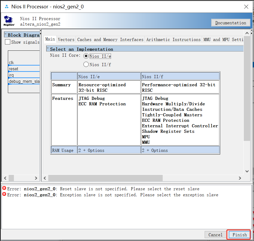 17.如果是免费版本的Quartus Prime( 即Lite版本), 请选择Nios II/e,然后点击Finish结束Nios II IP的设置: