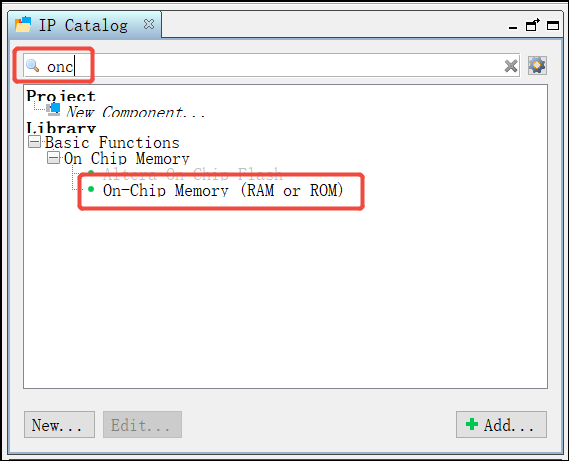 18. 在IP Catalog处键入onc 搜索找到On-Chip Memory,双击打开它的配置界面:
