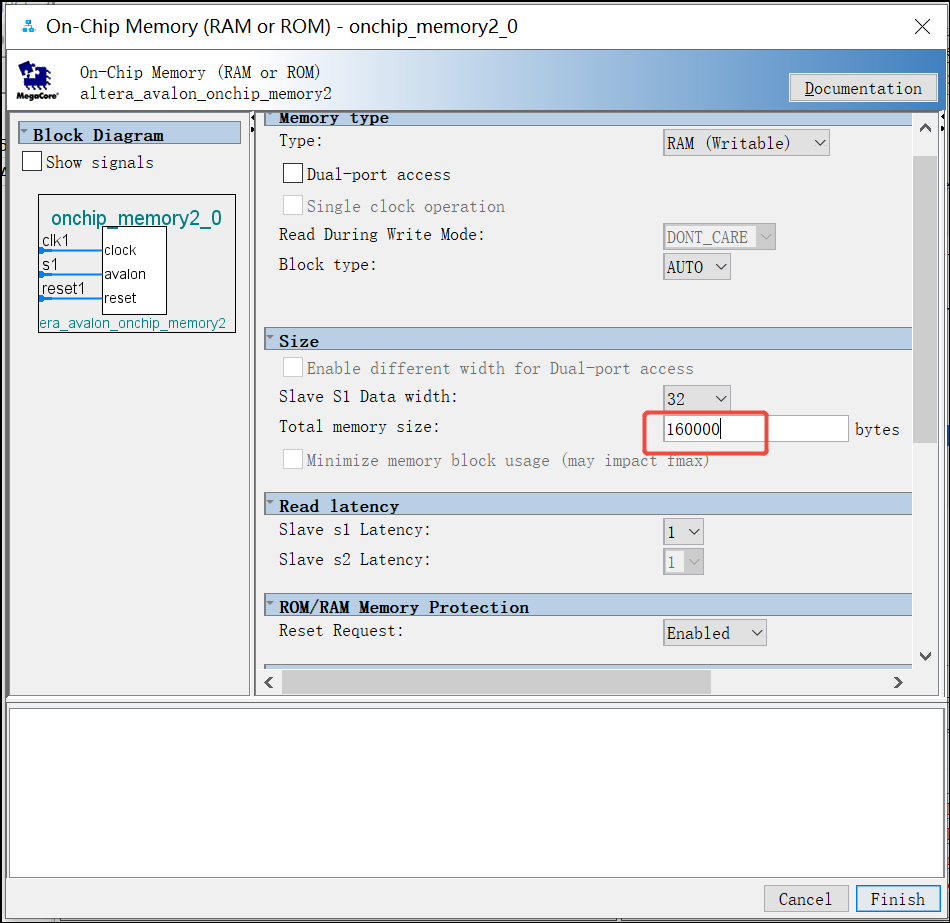 19. 数据宽度保持32bit, Memory Size设置160000字节, 然后点击Finish结束该IP的设置: