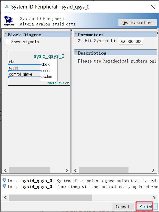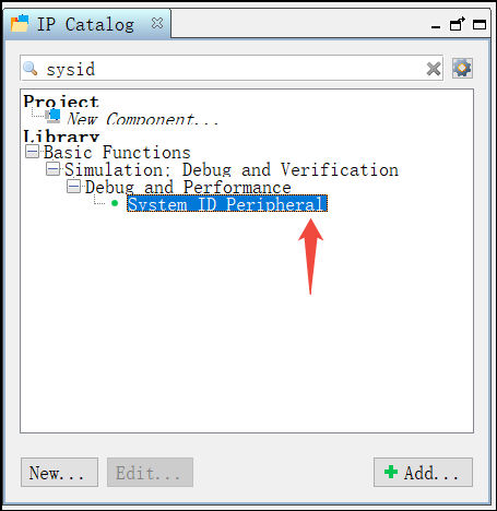 20. 在IP Catalog处键入sysid搜索找到System ID Peripheral IP,双击打开它的配置界面: