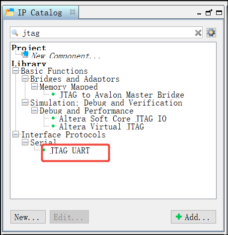 22. 在IP Catalog处键入jtag搜索找到JTAG UART IP,双击打开它的配置界面: