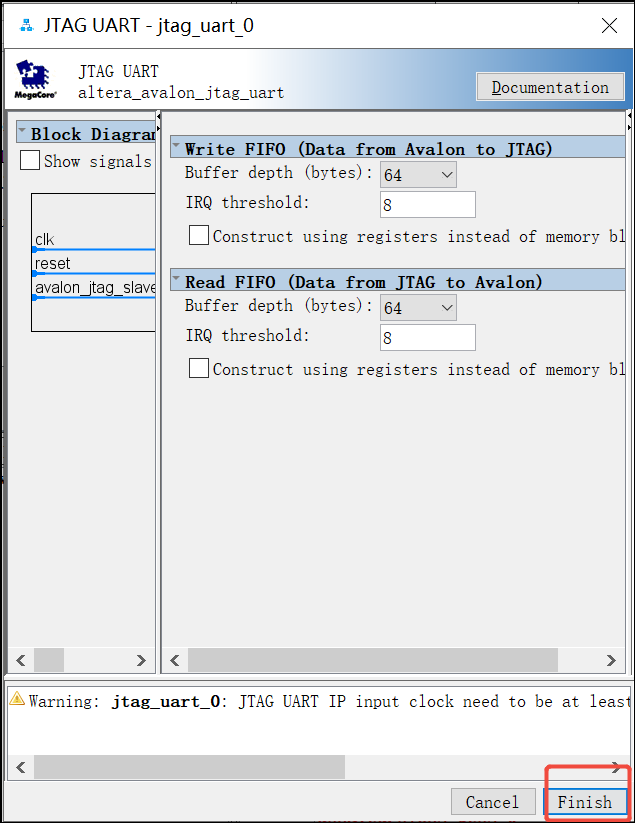 23.保持JTAG UART IP的默认设置不变,点击Finish: