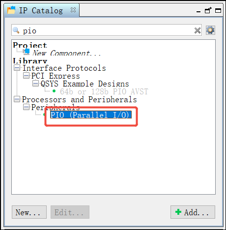 24. 在IP Catalog处键入pio搜索找到PIO(Parallel I/O) IP,双击打开它的配置界面: