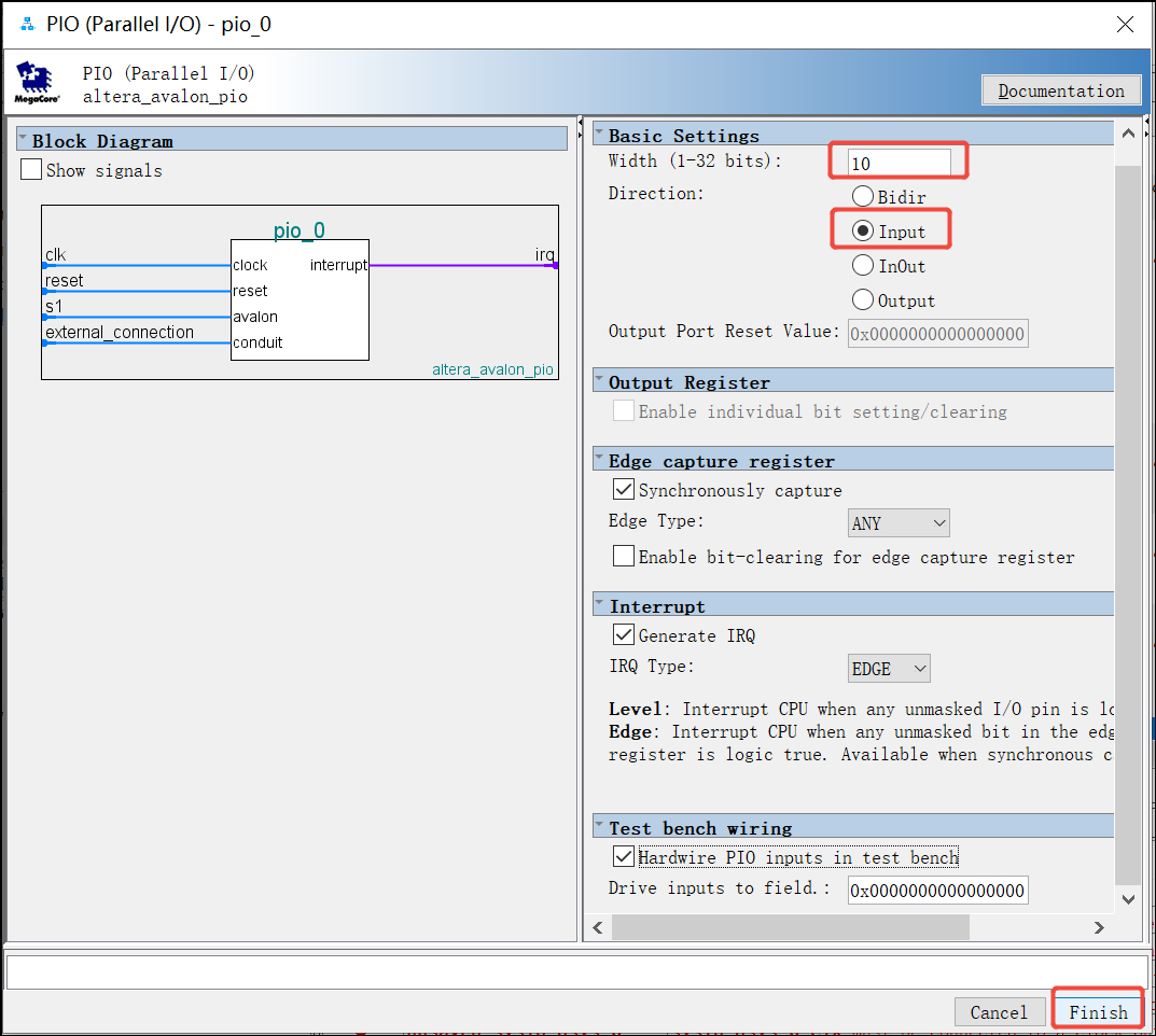 25. 将PIO IP 的位宽设置为10, Direction设置为Input,然后点击Finish结束PIO IP 的设置:
