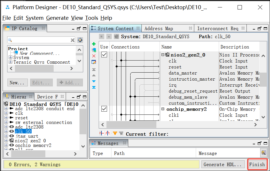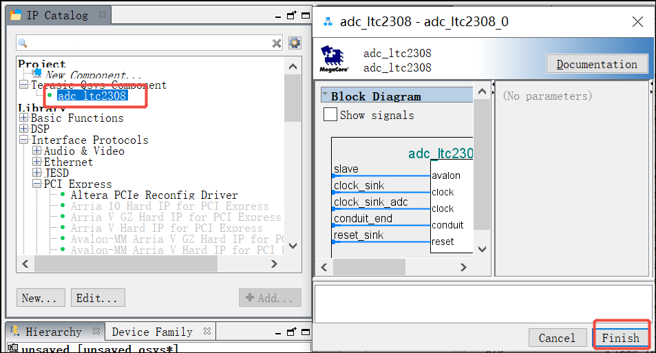 26. 双击IP Catalog 里面的自定义IP adc_ltc2308, 然后点击Finish: