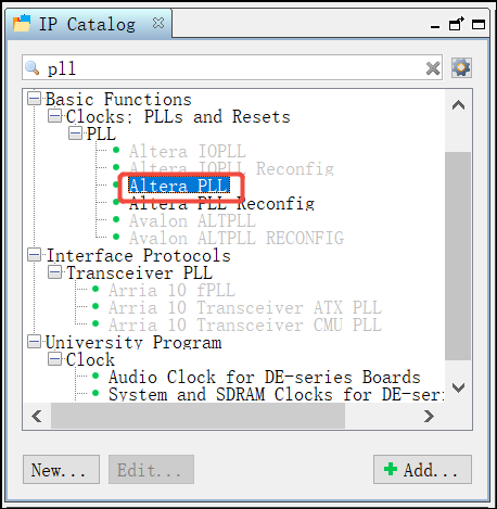 14. 在IP Catalog处键入pll搜索找到Altera PLL IP,双击打开它的配置界面: