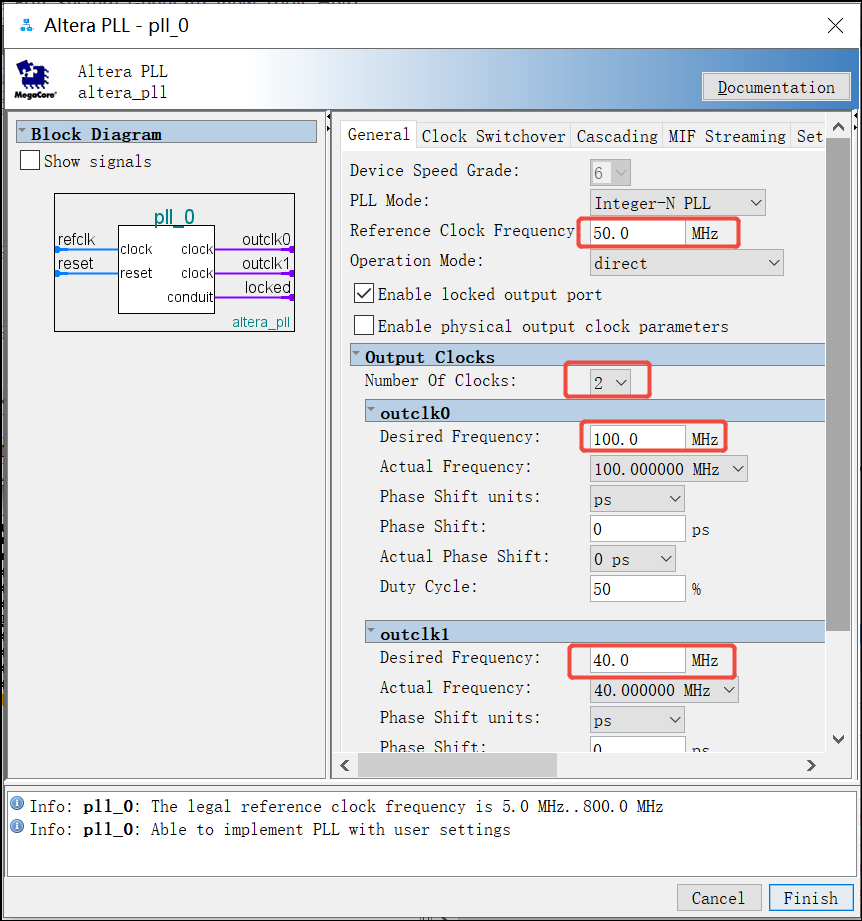 15. 设置 Reference Clock Frequency 为50MHz, 输出2路时钟,一路是100M, 用于各个模块的工作时钟,一路是40MHz, 用于输出给LTC2308器件,最后点击Finish完成PLL 模块的设置: