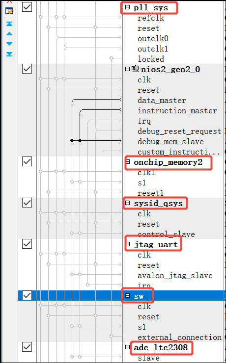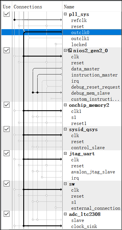 29. 然后是PLL 模块的outclk0 输出的100MHz时钟给其他所有模块,互连情况如下粗黑线: