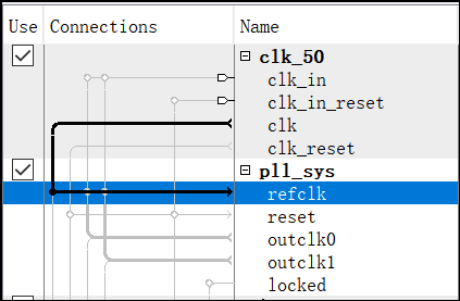 28. IP添加完成以后就可以进行IP之间的互连。Platform Designer 界面已经把可能互连的信号端口用暗浅色线相连,用户只需将鼠标放到两个端口相连的小圆圈处点击一下,就完成了真正的端口相连。首先是连接时钟网络。clk_50 的clk端口输出50MHz给PLL 模块 作为参考时钟,互联关系如下黑色粗线连接: