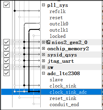 30. 接下来是PLL 模块的outclk1 输出的40MHz时钟给LTC2308,连接情况如下粗黑线: