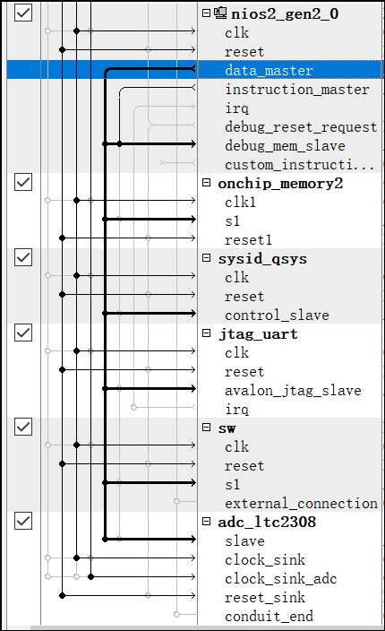 32. 将所有模块的slave端口都连接到nios2_gen2_0模块的data_master端口,连接情况如下粗黑线: