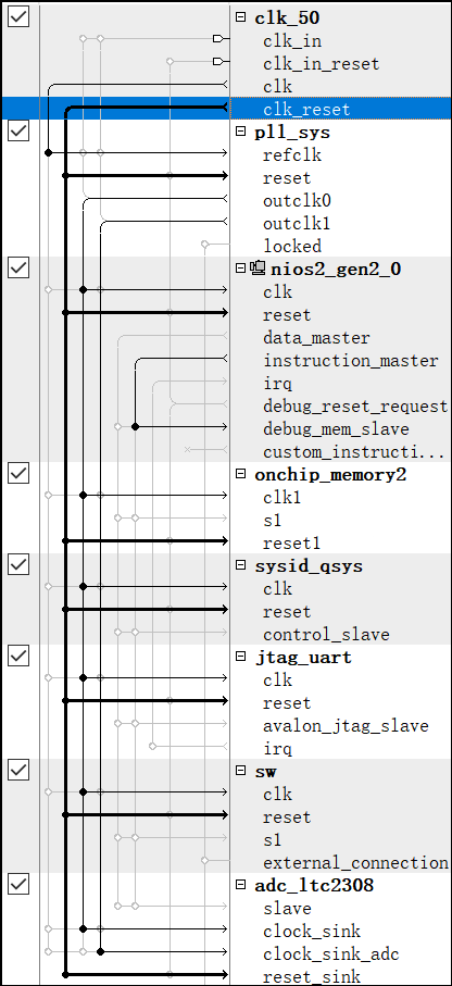 31. 将所有模块的复位端口都连接到clk_50 模块的复位端口,连接情况如下粗黑线: