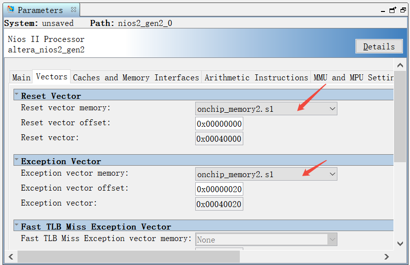 37.设置nios2_gen2_0的Reset vector memory 为onchip_memory2.s1,以及设置Exception vector memory 也为onchip_memory2.s1:
