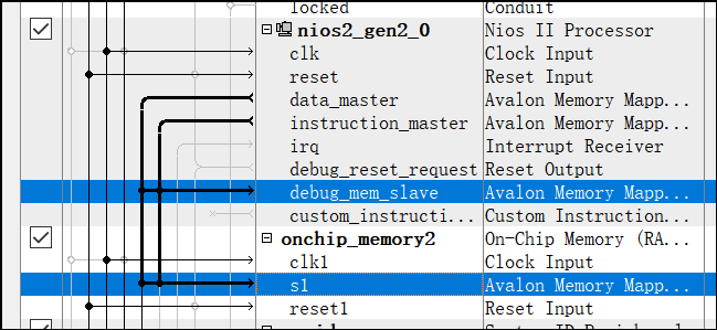 33. 将nios2_gen2_0的数据总线、指令总线跟debug_mem_slave和onchip_memory2的slave总线相连如下: