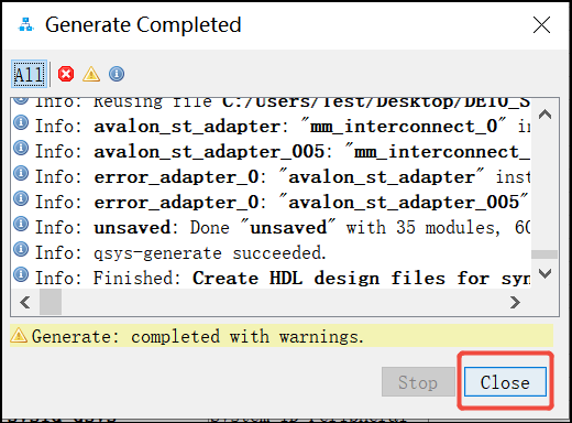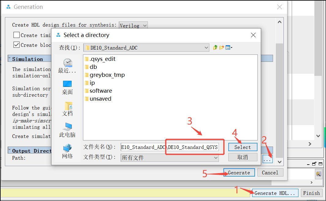 38. 点击Generate HDL...,然后在Path处点击...,这里直接将文件生成的路径设置到~DE10_Standard_ADC\DE10_Standard_QSYS,然后点击Select,然后点击Generate: