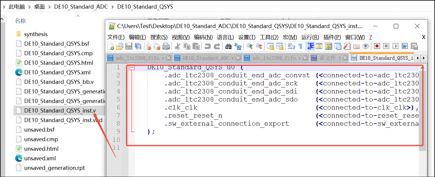 46. 打开~DE10_Standard_ADC\DE10_Standard_QSYS\DE10_Standard_QSYS_inst.v,将文件中的内容拷贝到刚才新建的.v文件里面: