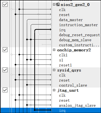 35.将jtag_uart的中断端口连接到nios2_gen2_0 的irq端口: