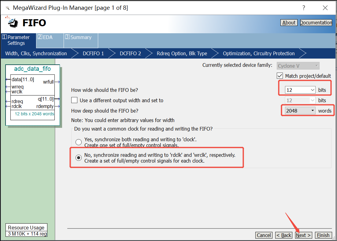 7. 随即跳出如下对话框,FIFO位宽设置为12bit,深度设置为2048个word。设置异步读写时钟,然后点击Next: