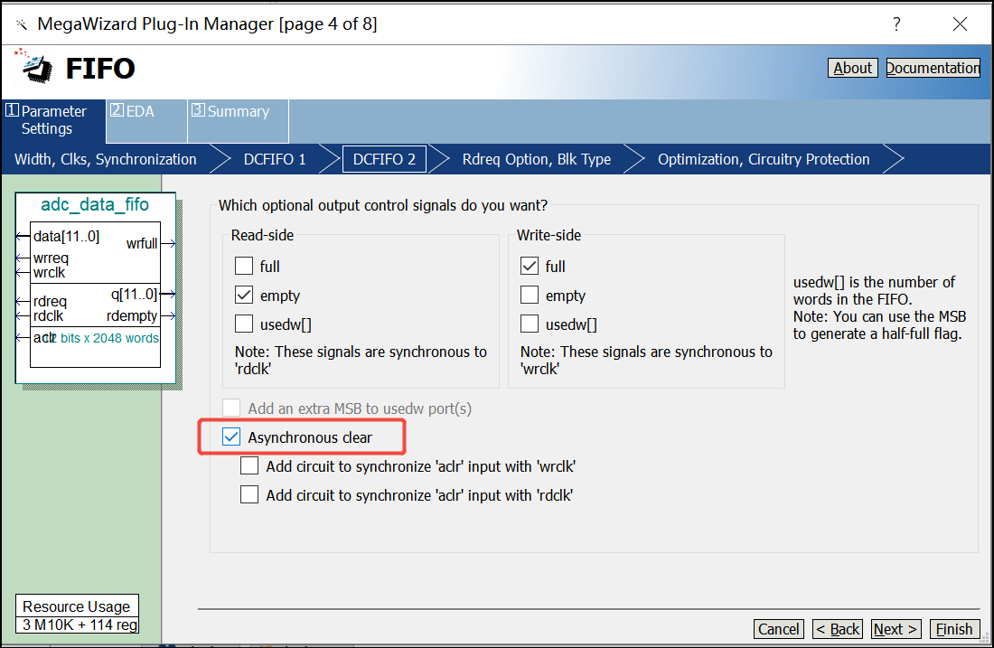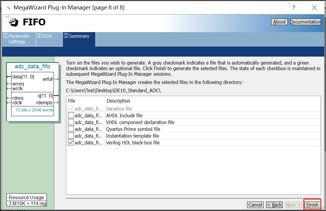 9. 接下来一直点击Next,直到如下界面出现,然后点击Finish结束FIFO 模块的设置: