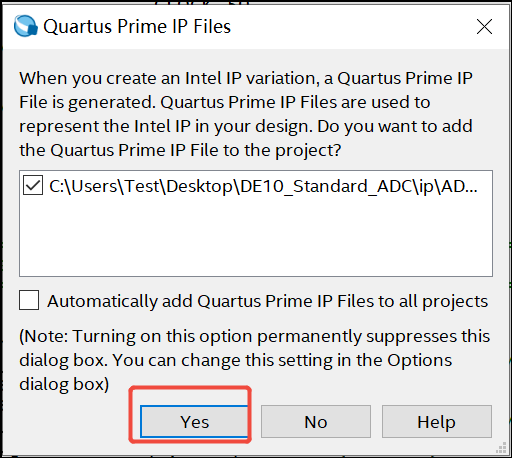 10. 系统会弹出对话框问是否将刚才配置好的FIFO IP 添加到工程,点击Yes: