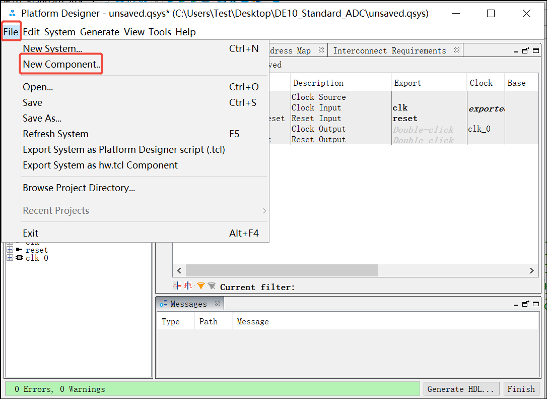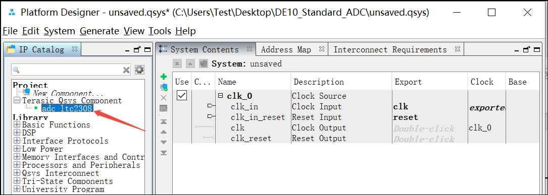32. 这时候再返回到Platform Designer 界面可以看到自定义IP adc_ltc2308已经在IP Catalog里面显示出来了, 接下来就可以在Platform Designer 里面调用这个IP了。