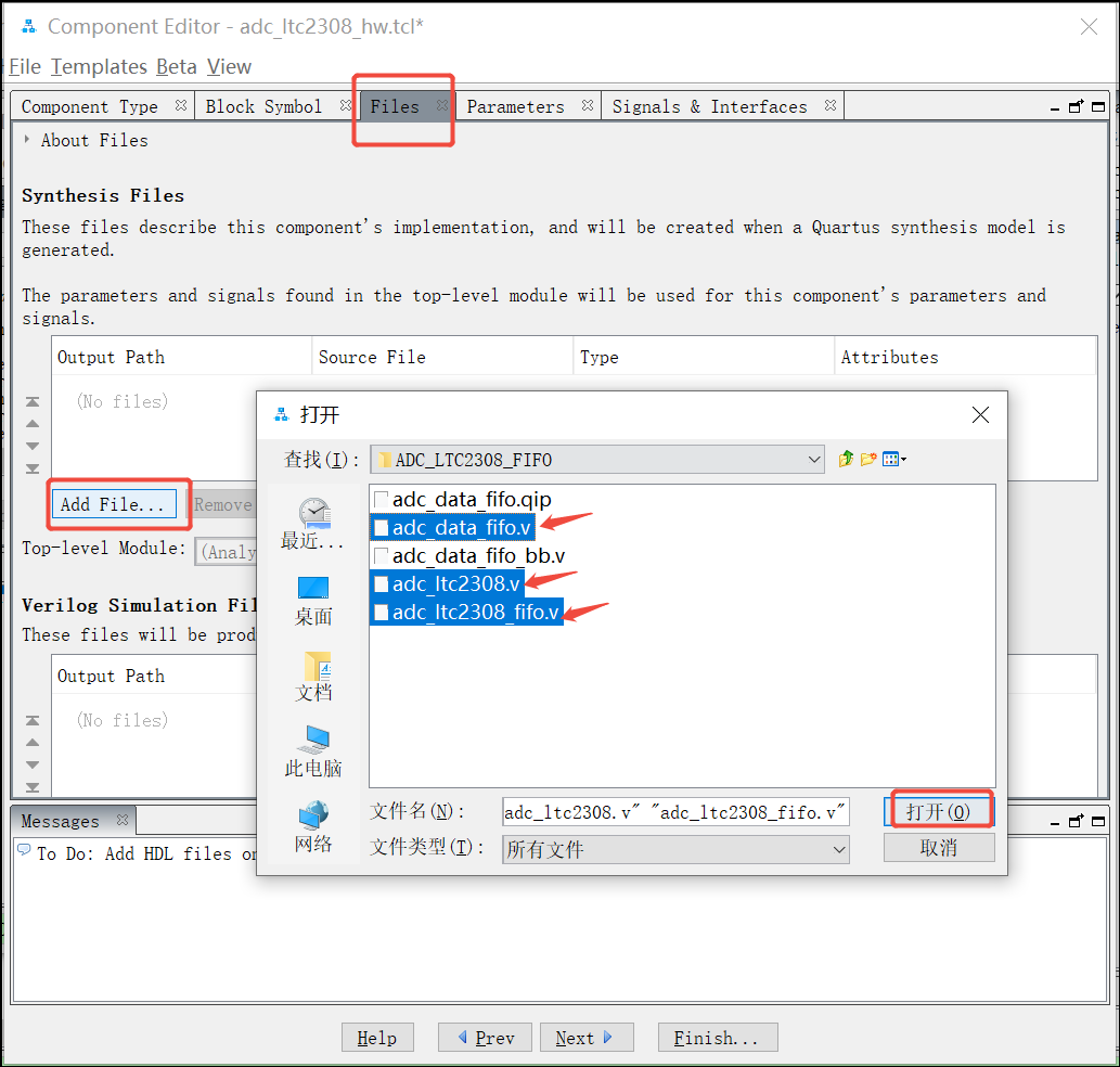 16.然后点击子页面Files,点击Add File..., 选择adc_data_fifo.v、adc_ltc2308.v和adc_ltc2308_fifo.v三个文件,点击打开: