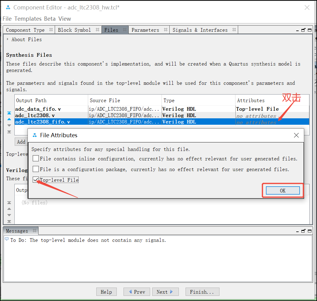 17.系统自动将adc_data_fifo.v文件默认为自定义IP的顶层文件了,而真正的顶层文件是adc_ltc2308_fifo.v,此时需要点击箭头处,然后将Top-level File复选框选上,然后点击OK: