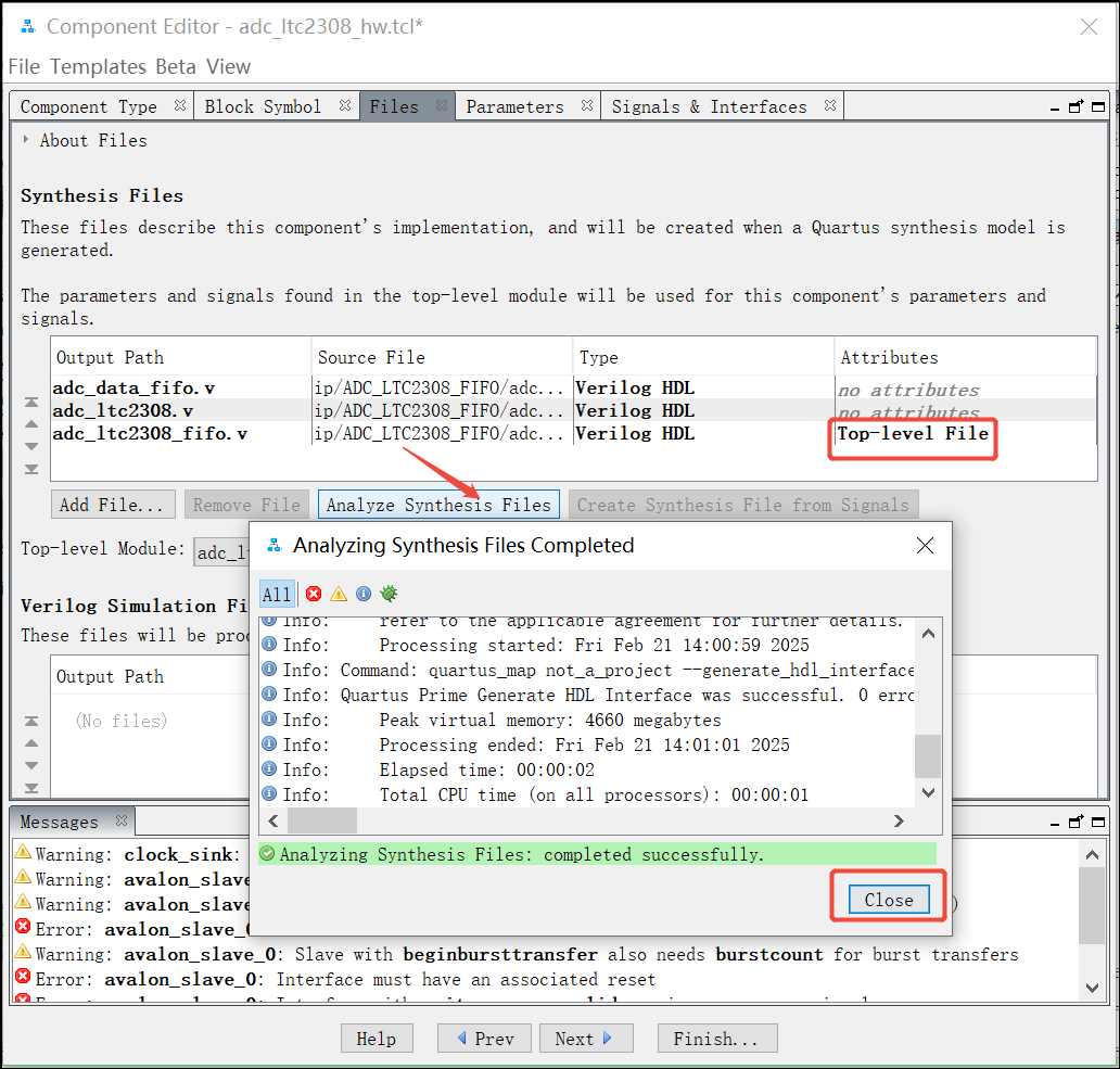 19. 返回到Files窗口,点击Analyze Synthesis Files 对文件进行分析和综合,Analyze Synthesis Files Completed窗口点击Close:
