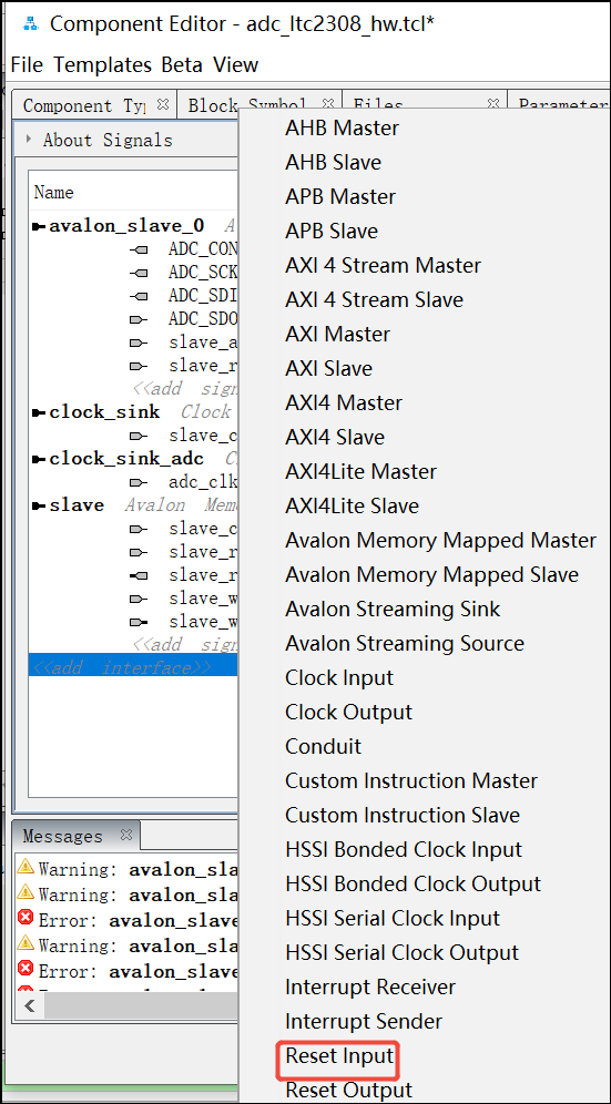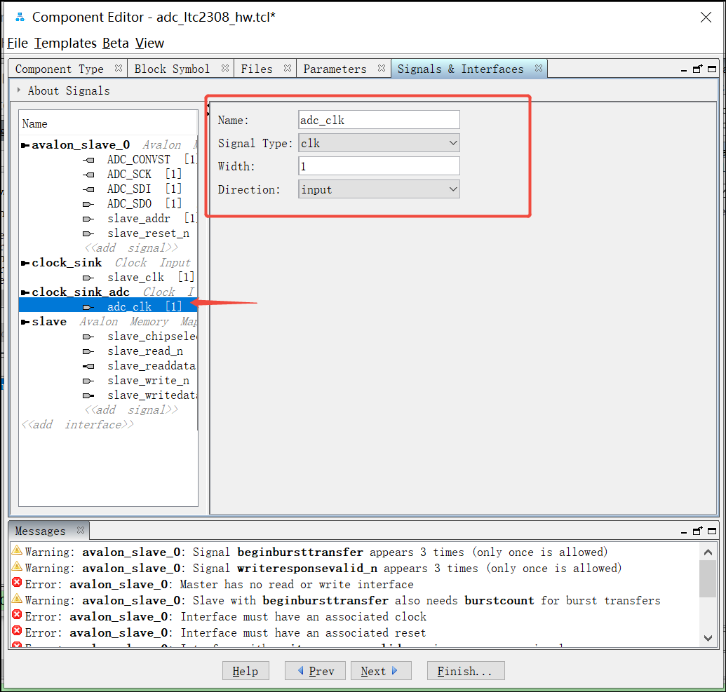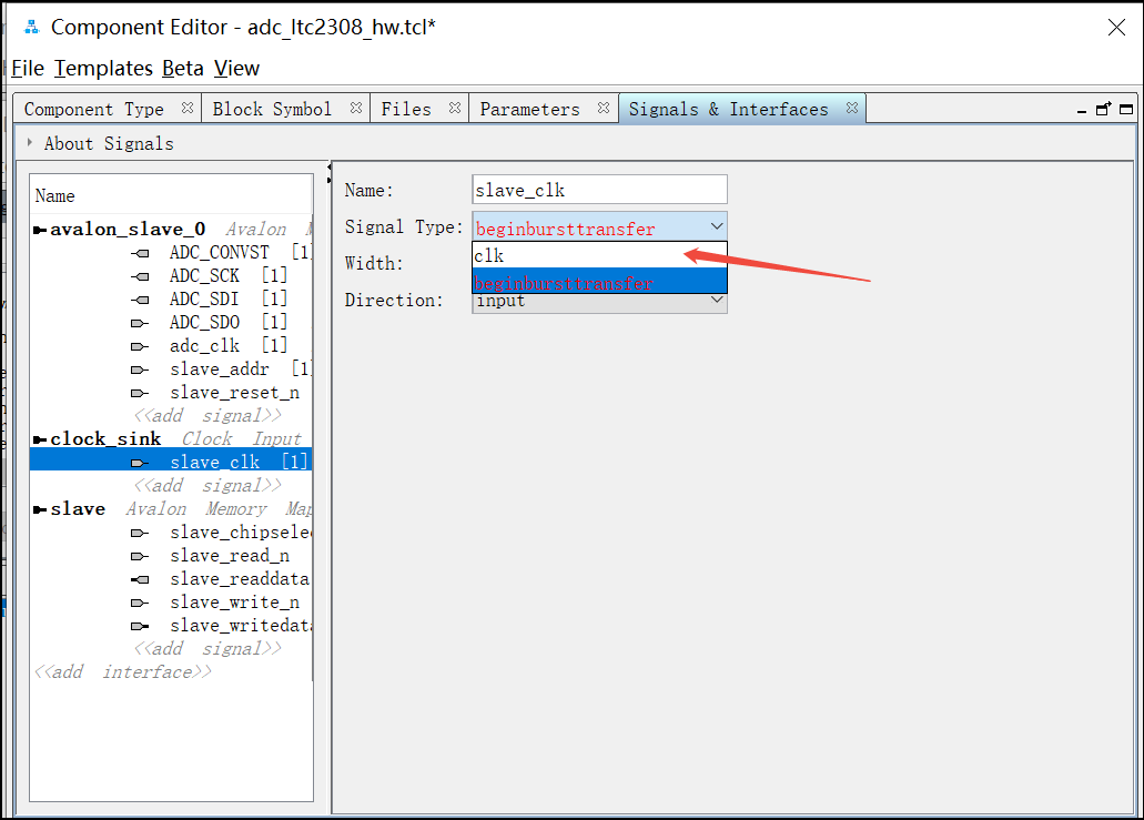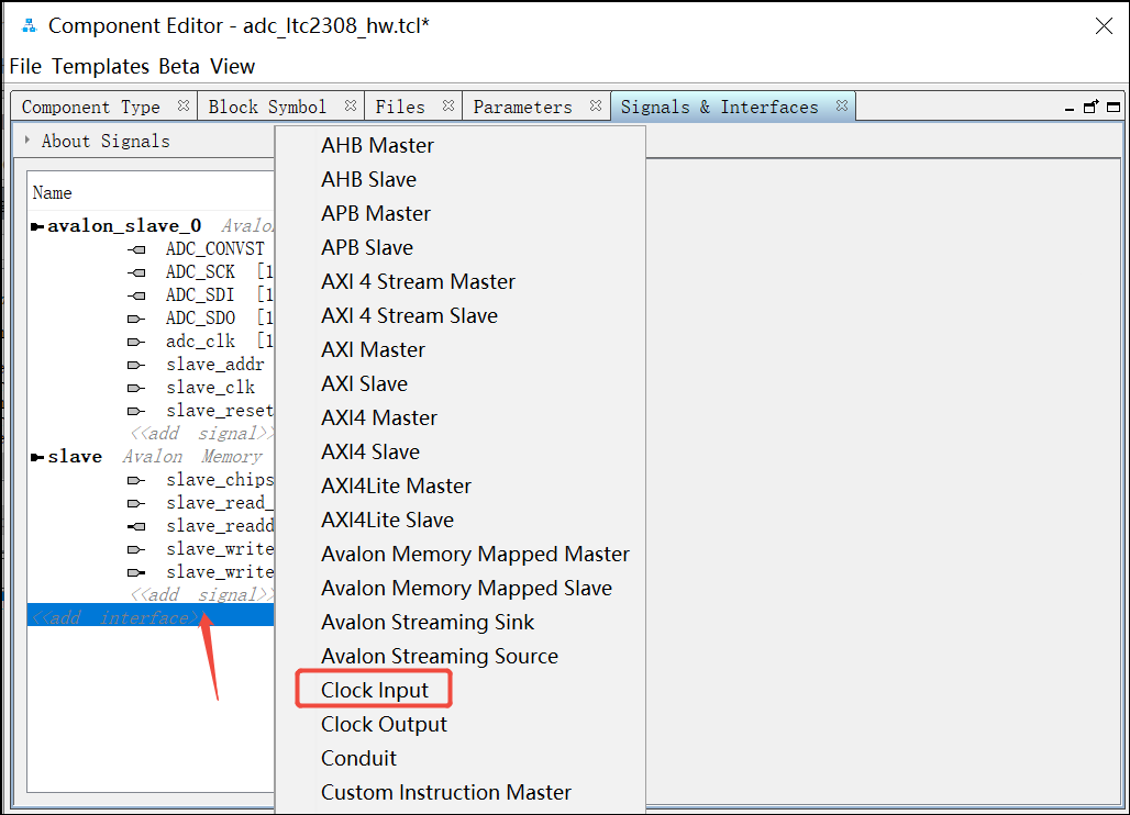 24. 再次点击add interface,选择Clock Input,然后将clock_sink_1改名字为clock_sink_adc, 并把adc_clk信号拖拽到clock_sink_adc下面,同样,adc_clk 信号的Signal Type 处选择clk: