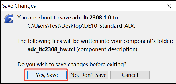 31.点击Yes,Save来保存自定义IP的所有设置到adc_ltc2308_hw.tcl文件当中:
