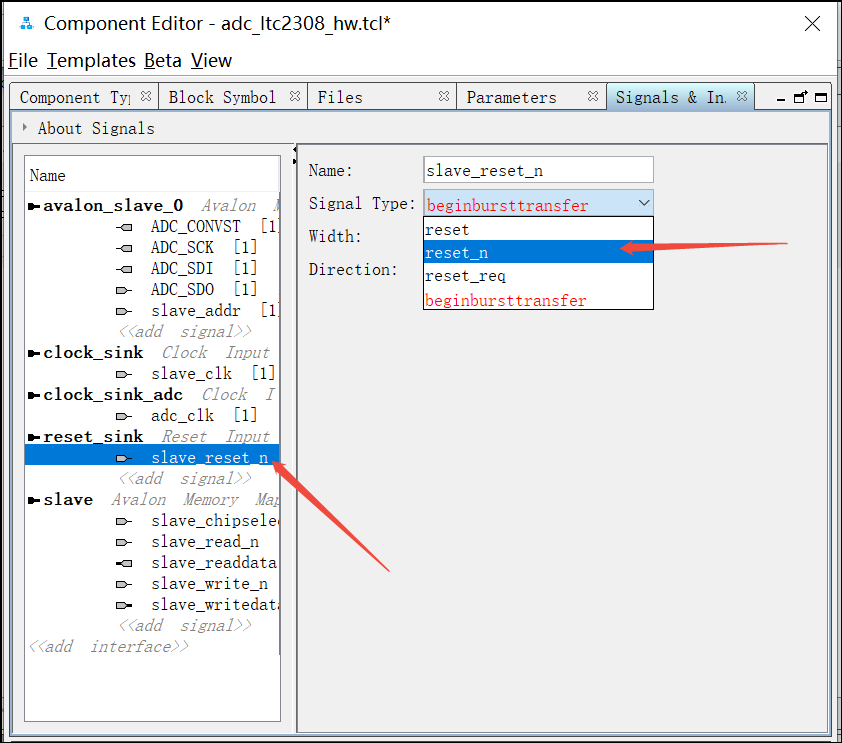 26. 将slave_reset_n信号拖拽到reset_sink接口下面, 并在Signal Type处选择reset_n: