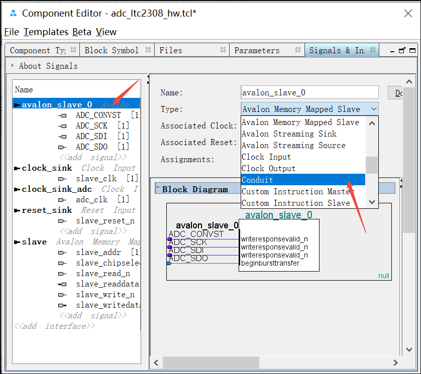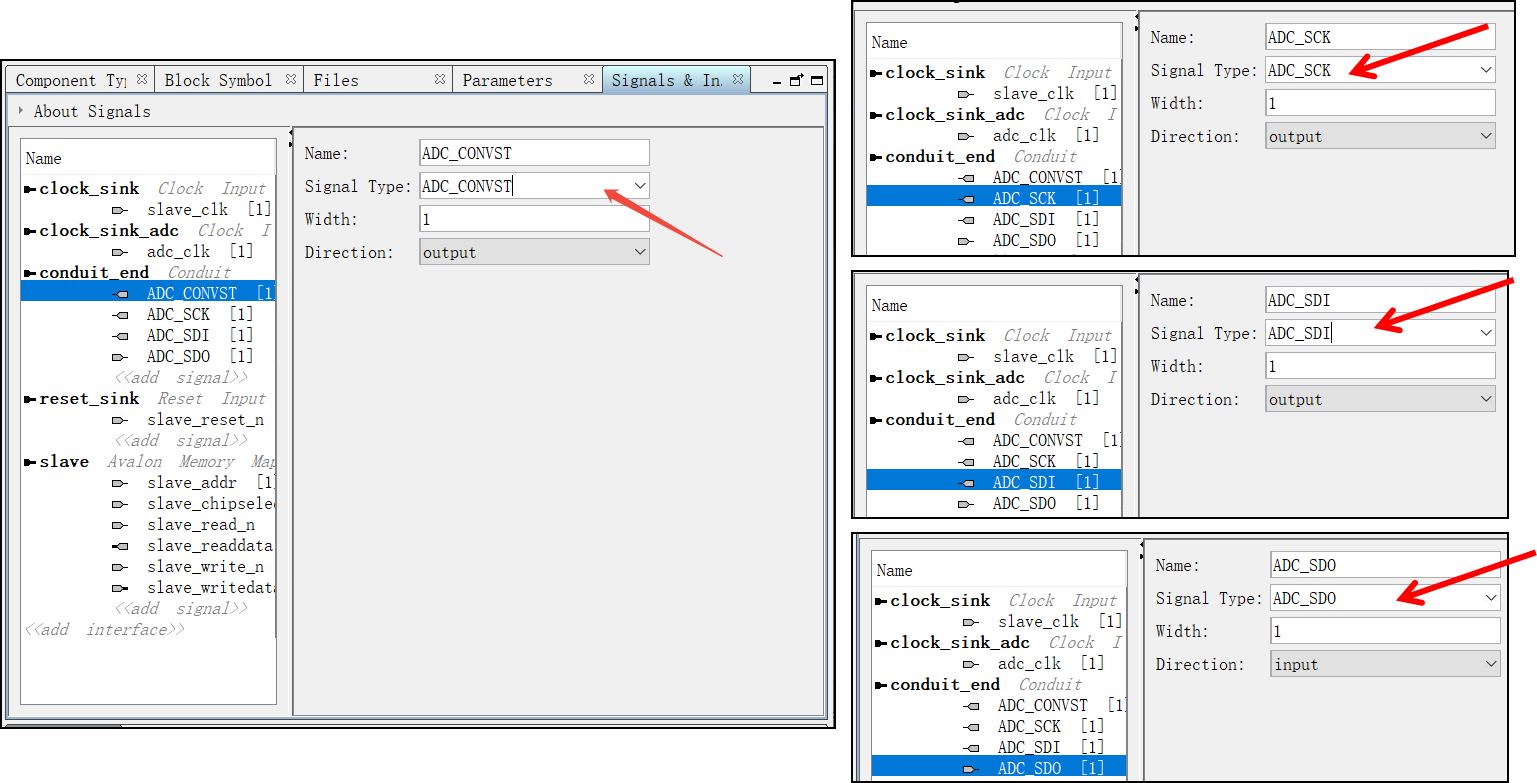 29. 将Conduit接口下面的ADC_CONVST、ADC_SCK、ADC_SDI、ADC_SDO接口的Signal Type改成跟接口一样的名称: