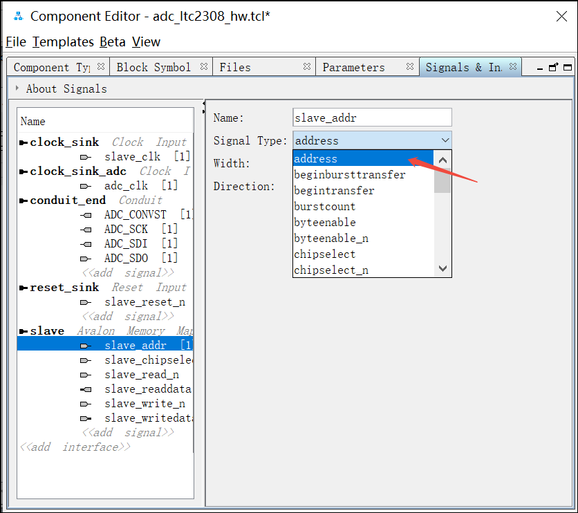 27.将slave_addr信号拖拽到slave接口处,Signal Type处选择address :