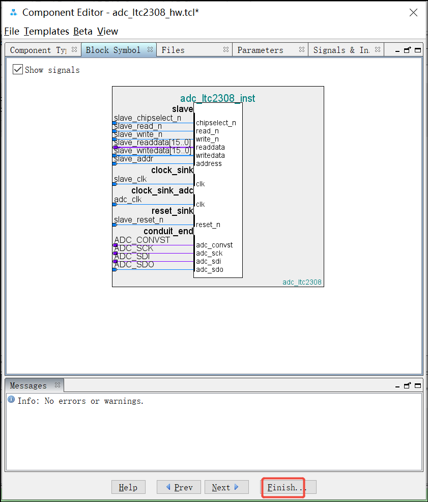 31. 这时候返回子页面Block Symbol 查看到如下接口框图,最后点击Finish完成自定义IP的封装: