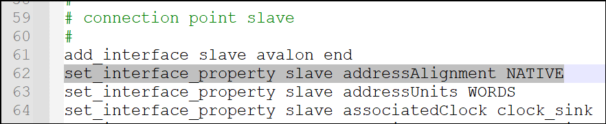 如今自定义IP 都是默认使用动态地址对齐,本案例的Nios 程序使用静态地址对齐(每个寄存器在Avalon总线上占4个字节的地址),此时需要在hw.tcl脚本里加上一句话:set_interface_property slave addressAlignment NATIVE