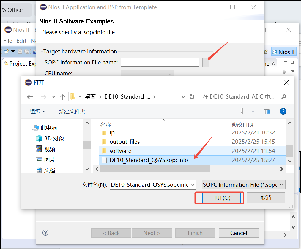 6. 点击SOPC Information File name 处的...打开SOPC文件选择窗口,选择DE10_Standard_QSYS.sopcinfo文件: