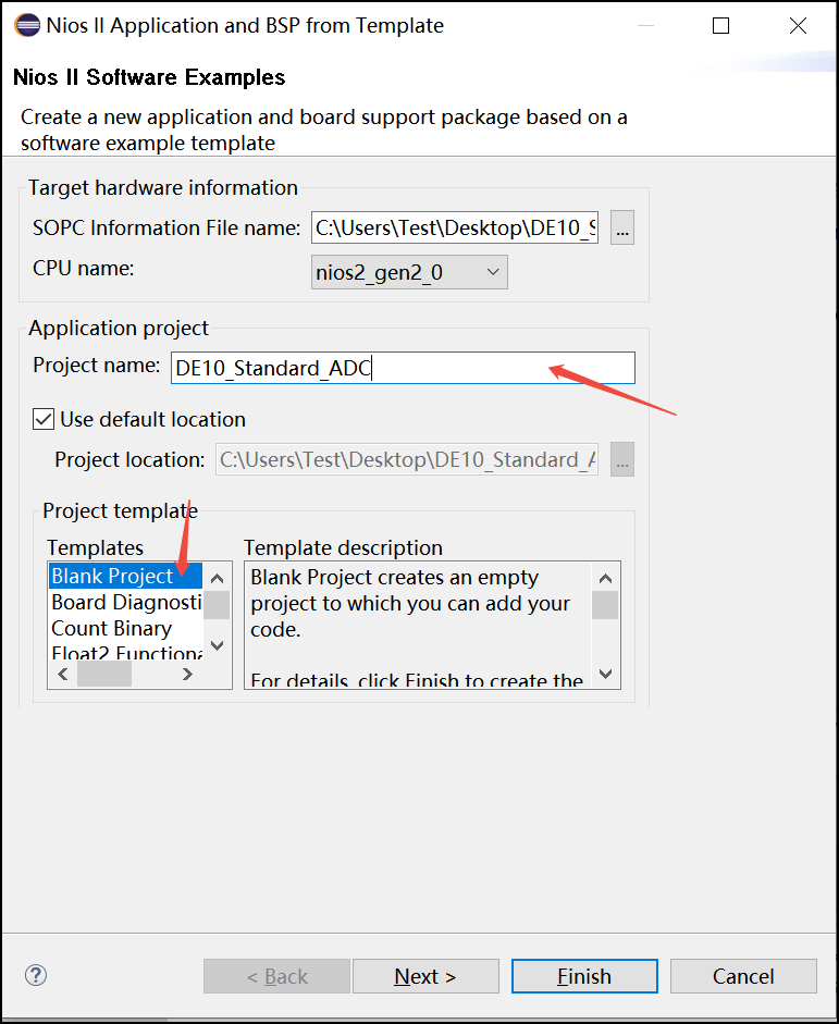 7. 在Project name 处填上软件工程的名称DE10_Standard_ADC, 然后选择Blank Project: