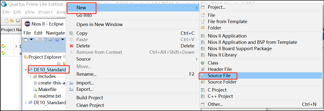 8. 在 Project Explorer 中,选中 DE10_Standard_ADC,右键,选择 New --> Source File,