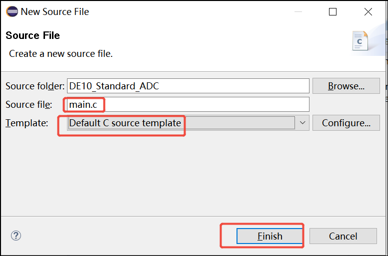 9. 在Source file 处填上main.c,Template选择Default C sourcetemplate: