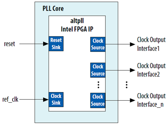 Avalon时钟接口定义了组件使用的时钟,一个组件可以有时钟输入、时钟输出或时钟输入输出都含有。例如,锁相环(PLL)是一个包含了时钟输入和时钟输出的组件,如图2所示。