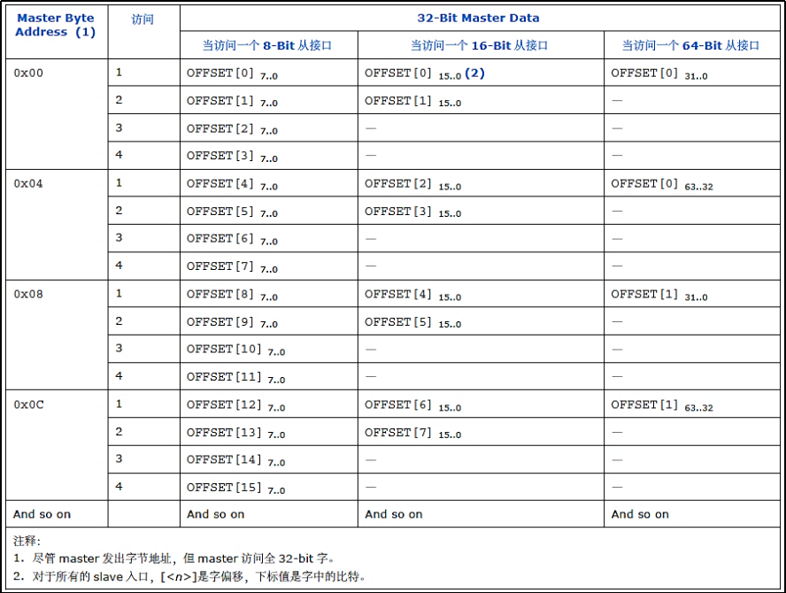 Slave的数据宽度必须是8、16、32、64、128、256、512 或者1024位。下表列出了32位的master按字访问不同位宽的slave数据时是如何与master对齐的,OFFSET[N]表示slave地址空间字的偏移量。