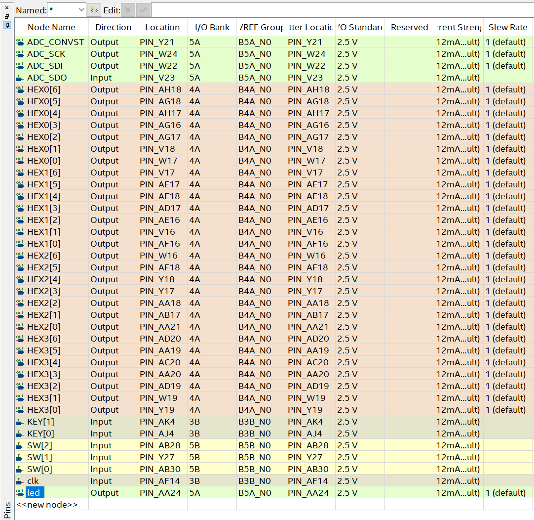 根据DE10-Standard\Manual\DE10-Standard_User_manual.pdf手册的引脚分配表或者直接查看DE10-Standard\Schematic\DE10-Standard.pdf电路图完成以下引脚分配: