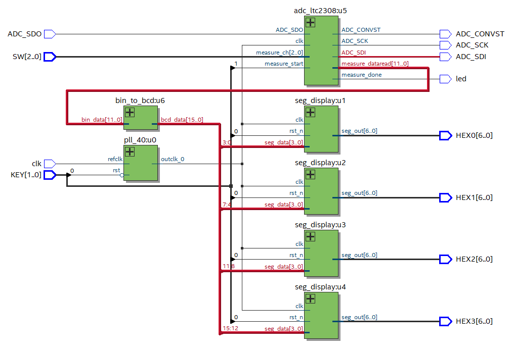 设计一个数字电压表,通过滑动开关SW[2:0]切换LTC2308不同的ADC通道,通过按键KEY[1]触发LTC2308进行采样和转换,每次转换完点亮一个led灯作为指示,通过数码管HEX[3:0]将转换得到的数字值进行显示。