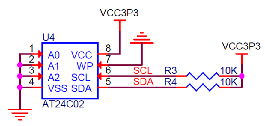 I2C EEPROM 使用的是 AT24C02,它是一个串行的 Flash 存储器,容量为 2K bit。下图给出了 I2C Flash 部分的连接原理图。