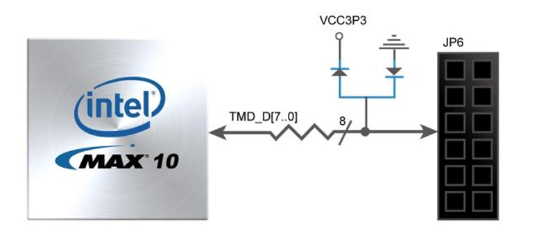 T-Core 开发板上有一个 2×6 的扩展接口 TMD(Terasic Mini Digital)。TMD 扩展接口有 8 个数字 GPIO 用户引脚连接到 MAX 10 FPGA,还有两个引脚连接到电源、两个引脚连接到 GND。有两个瞬态电压抑 制二极管阵列用于实现对 8 个 GPIO 用户引脚的防静电和过压保护。下图 为 T-Core 开发板 TMD 扩展 接口和 FPGA 之间的连接示意图。