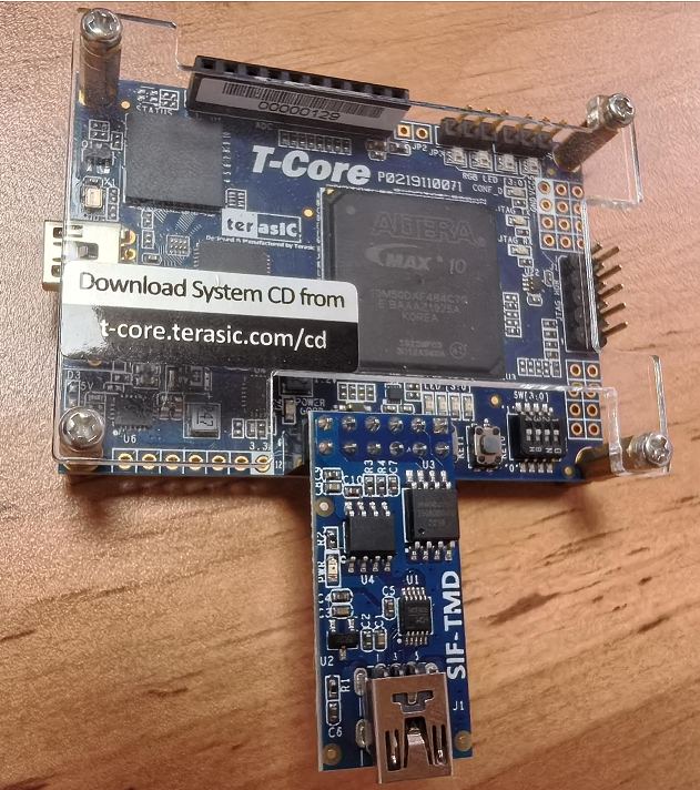 T-Core 开发板没有 UART 接口,将具有 UART 接口的 SIF 子卡连接到 T-Core 开发板上的 TMD 扩展接 口,则可在 T-Core 开发板上实现 UART 串口收发功能。T-Core 开发板与 SIF 子卡的实物连接如图所 示: