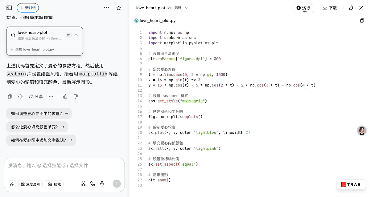 豆包生成的 Python 产物可以直接运行,要是报错了,还可以一键「AI 修复」。对于 Python 初学者来说,免去了繁杂的环境配置等环节;对于开发者来说,能实时验证生成结果,并节省错误的调试时间,开发过程更加流畅。