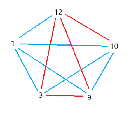 将互质的两个数之间连上蓝边,不互质的两个数连上红边,如图: