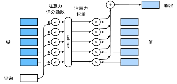 - 即意志搜索(q)和非意志搜索(k)之间的交互形成了注意力汇聚。注意力汇聚有选择的聚合了值(v),以生成最终的输出。