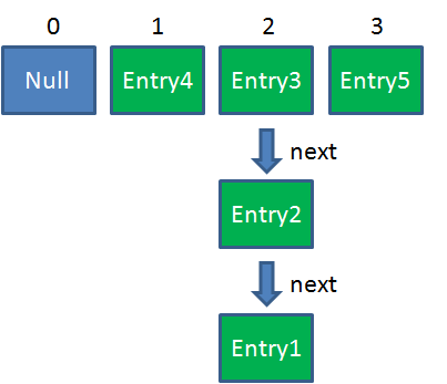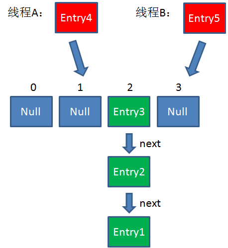 接下来执行下面的三行,用头插法把Entry2插入到了线程B的数组的头结点: